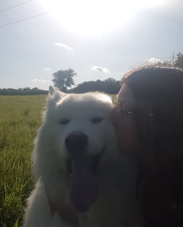 Falk c'est un chien que j'ai adopté quand il avait 9 ans. Il avait déjà eu une vie bien remplie avant d'arriver chez moi : il vivait avec d'autres samoyèdes, avait voyagé pour participer à des courses de traîneaux.