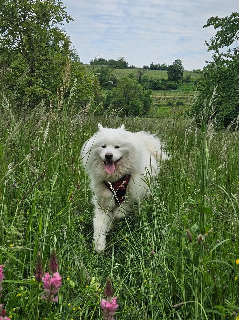 Falk c'est un chien que j'ai adopté quand il avait 9 ans. Il avait déjà eu une vie bien remplie avant d'arriver chez moi : il vivait avec d'autres samoyèdes, avait voyagé pour participer à des courses de traîneaux.